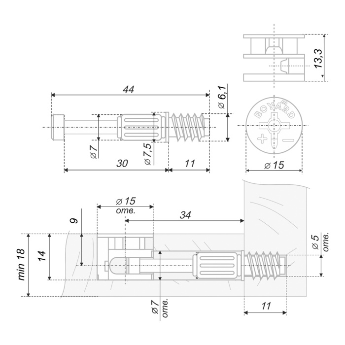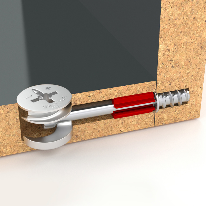 Красный поворотный фиксатор позволит удобно удерживать дюбель при монтаже в пласть. Наличие зауженного стартового витка гарантирует плавное закручивание стяжки без повреждения поверхности. Высота эксцентрика требует отверстия под сверление 14 мм.