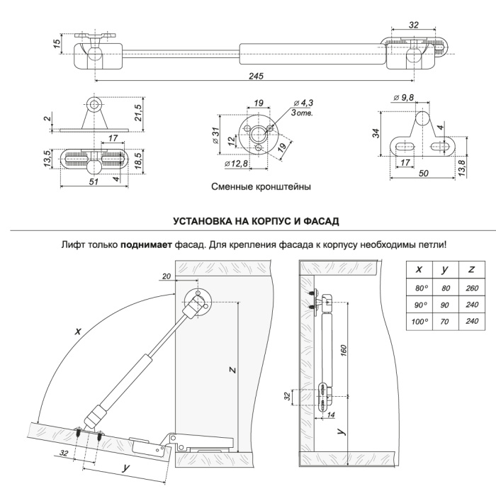 GL103 поставляется в комплекте с тремя кронштейнами — для крепления к боковой стенке корпуса, для крепления к фасаду из плитных материалов (ЛДСП/МДФ) и к фасаду из алюминиевого профиля.