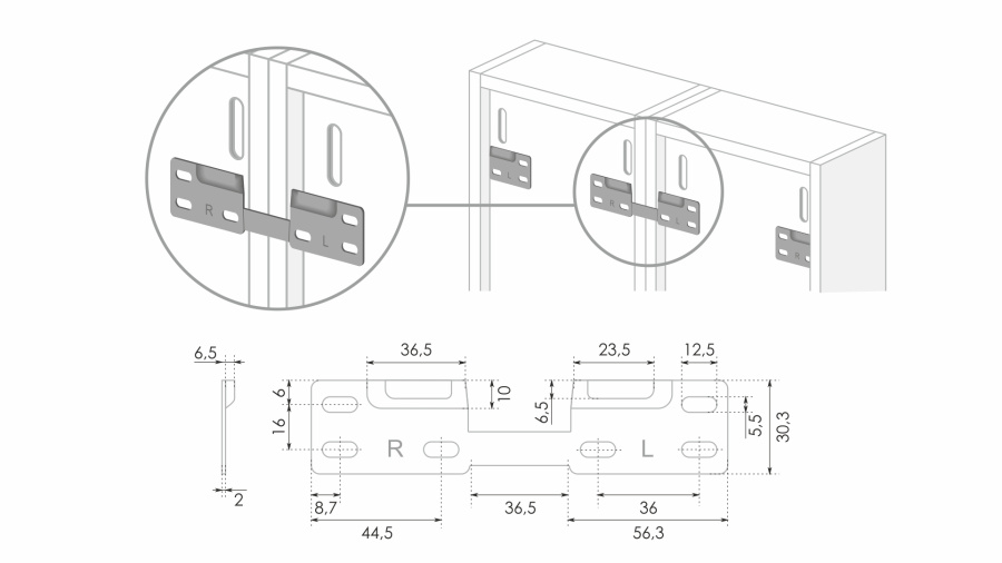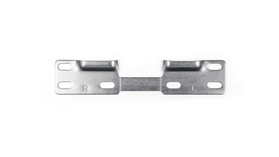 Специальная монтажная планка навеса изготовлена из стали толщиной 2 мм и представляет собой планки для левой и правой стороны короба, соединенные стальной пластиной. При монтаже самостоятельных модулей необходимо разъединить планки. При