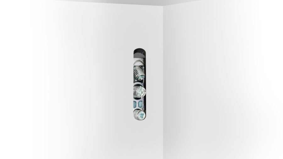 Стальной навес врезного монтажа со специальной монтажной планкой. Навес монтируется в боковые стенки короба со стороны задней стенки и, благодаря заглушкам, практически незаметен для пользователя. Фиксирующий винт прочно закрепляет навес на стальной монтажной планке и гарантирует сохранность конструкции даже при сильном воздействии на модуль снизу. Дополнительное крепление саморезами, установленными под углом, исключает вырывание навеса из короба при сильном горизонтальном воздействии. Технические детали навеса закрыты для пользователя пластиковыми заглушками.