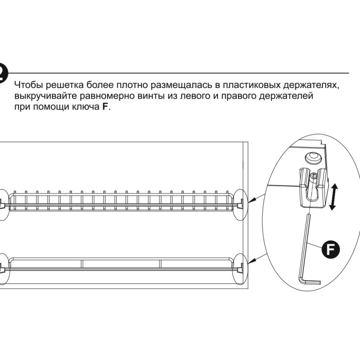 Модель предусматривает лёгкую регулировку и надёжную фиксацию положения решёток с помощью специального ключа, который идёт в комплекте. Благодаря регулировке и фиксации возможно достичь идеального, неподвижного положения решёток в пазах пластиковых держателей. Весь крепёж закрыт крышками держателей и надёжно защищен от влаги.