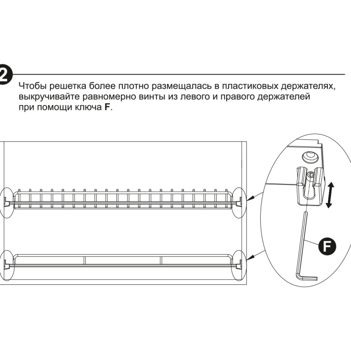 Модель предусматривает лёгкую регулировку и надёжную фиксацию положения решёток с помощью специального ключа, который идёт в комплекте. Благодаря регулировке и фиксации возможно достичь идеального, неподвижного положения решёток в пазах пластиковых держателей. Весь крепёж закрыт крышками держателей и надёжно защищен от влаги.