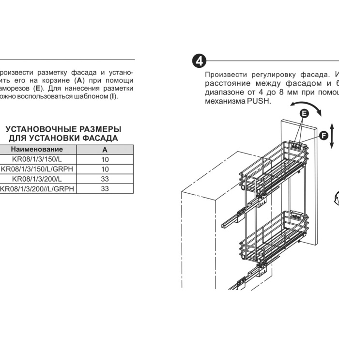 Специальный красный регулировочный винт в конструкции направляющих и риски на корпусе механизма позволят отрегулировать расстояние между фасадом и боковой стенкой мебельного короба в диапазоне от 4 до 8 мм, тем самым отрегулировать срабатывание механизма под конкретное мебельное изделие и выстроить все фасады в единую линию.