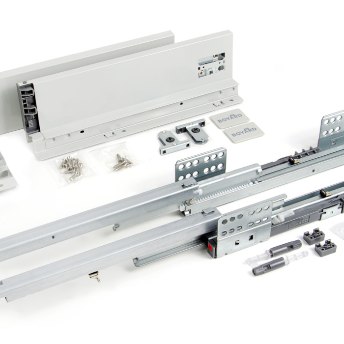 СТАРТ PUSH SB28 — комплект систем выдвижения для сборки выдвижного мебельного ящика с прямыми боковинами стандартной высоты с открытием от нажатия для мебели без ручек.