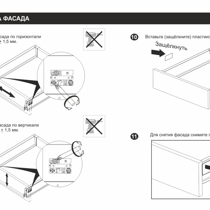 Конструкция СТАРТ PUSH SB28 имеет регулировочный красный винт — он позволяет выровнять фасады по глубине и компенсировать погрешности производства и монтажа. Специальные риски на направляющей помогут выставить одинаковое положение регулировки на обеих направляющих (левой и правой).
