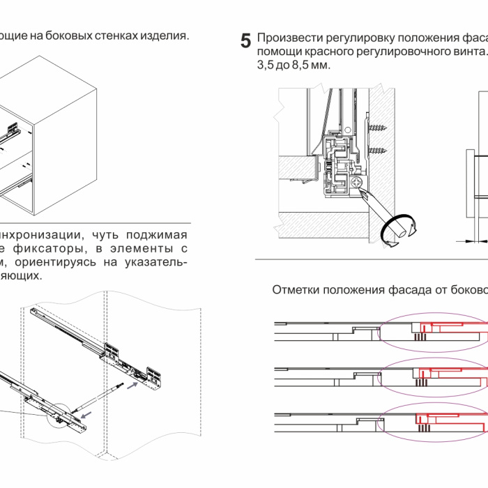 Конструкция СТАРТ PUSH SB28 имеет регулировочный красный винт — он позволяет выровнять фасады по глубине и компенсировать погрешности производства и монтажа. Специальные риски на направляющей помогут выставить одинаковое положение регулировки на обеих направляющих (левой и правой).